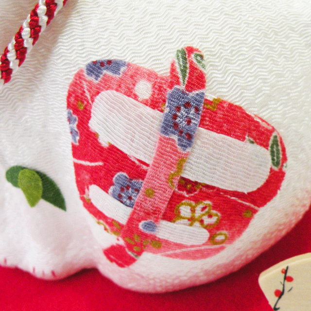 おなかに「申」の文字が、華やかなちりめんであしらわれています。