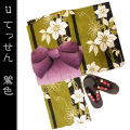 送料無料【凛】てっせん(鶯色)☆高級変わり織り浴衣☆4点セット☆ゆかた+作り帯+下駄+腰紐