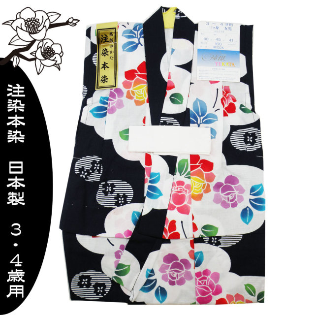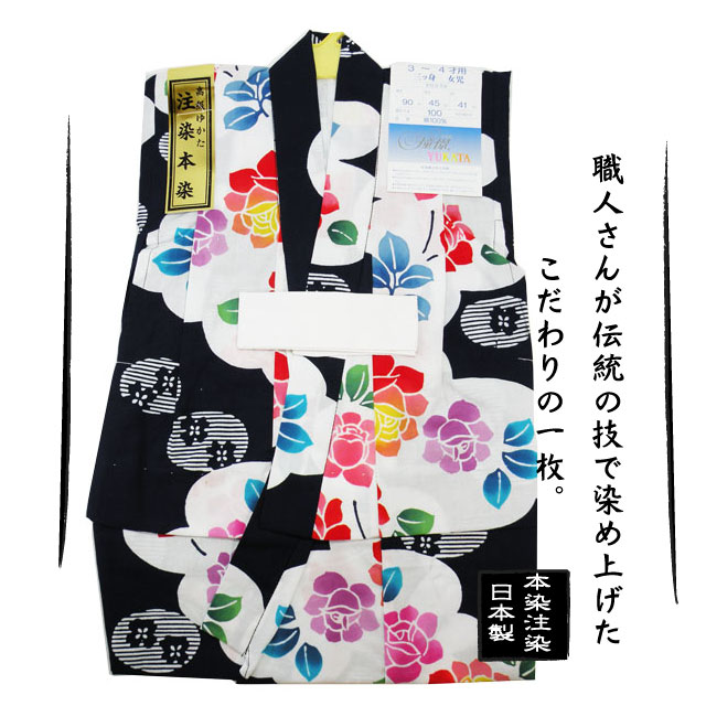 【本染注染】こども浴衣 「ばら」 紺色 日本製 女児100センチ 3・4歳用