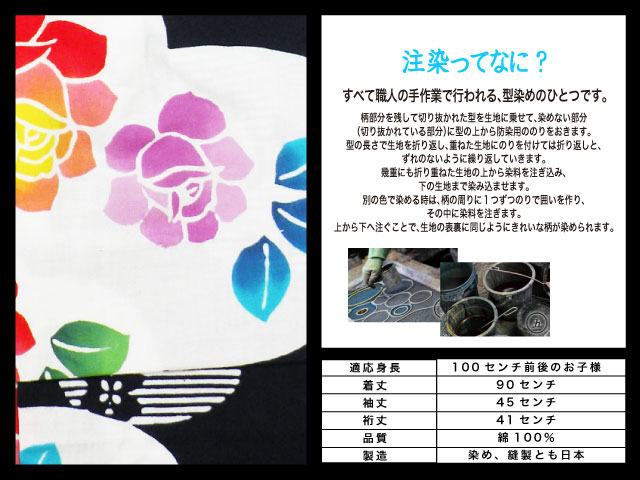 • 【本染注染】こども浴衣 「ばら」 紺色 日本製 女児100センチ 3・4歳用